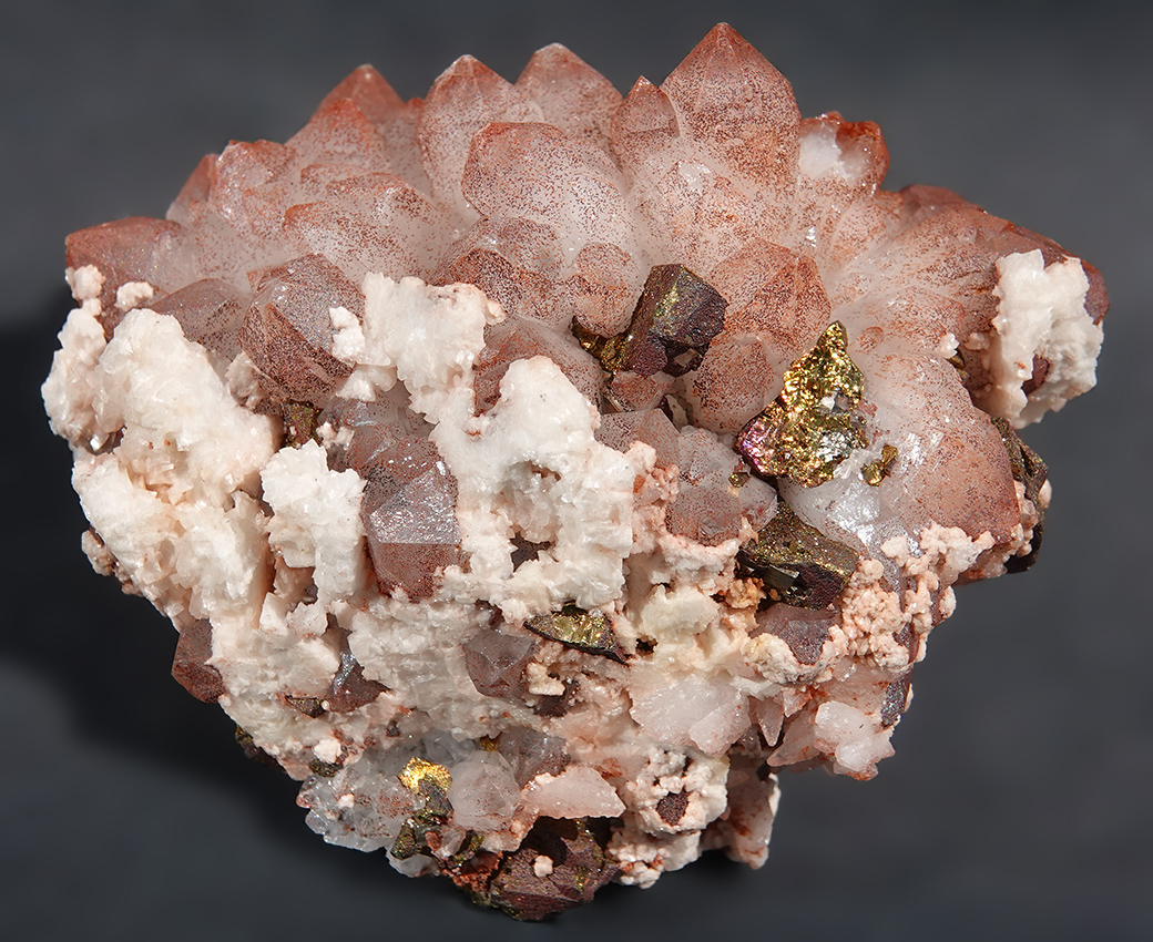 Rhodochrosite, pyrite, quartz et chalcopyrite du Pérou