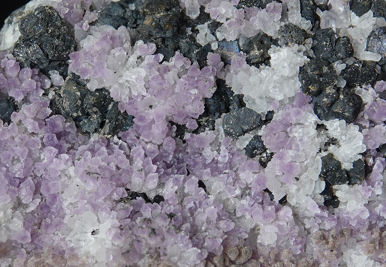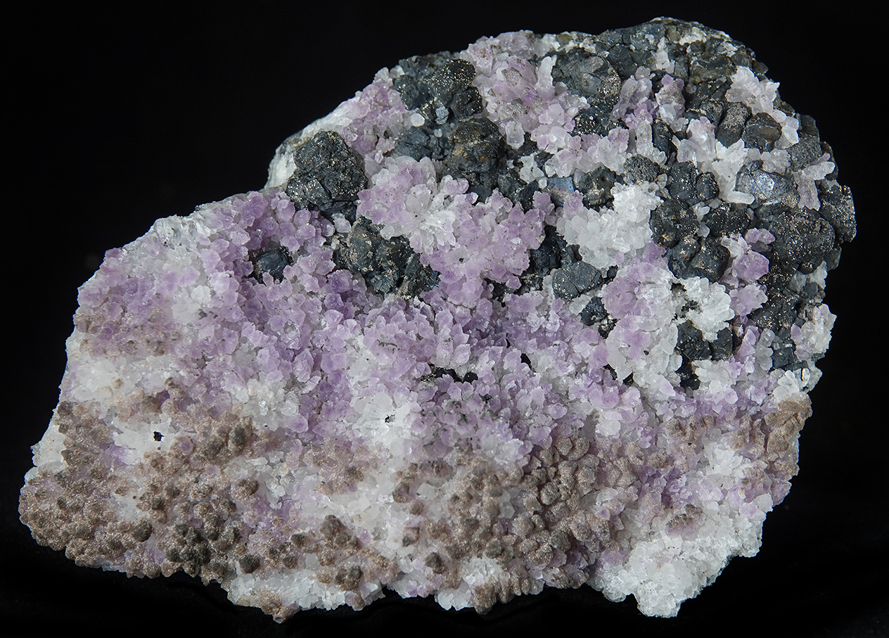 Cristaux d’améthyste partiellement recouverts de très fines aiguilles de pyromorphite beige. Cristaux de sphalérite (variété cléophane recouverte d’un enduit gris sombre) saupoudrés de microcristaux de pyrite et de pyromorphite. (Paragenèse et spécimen rare !)