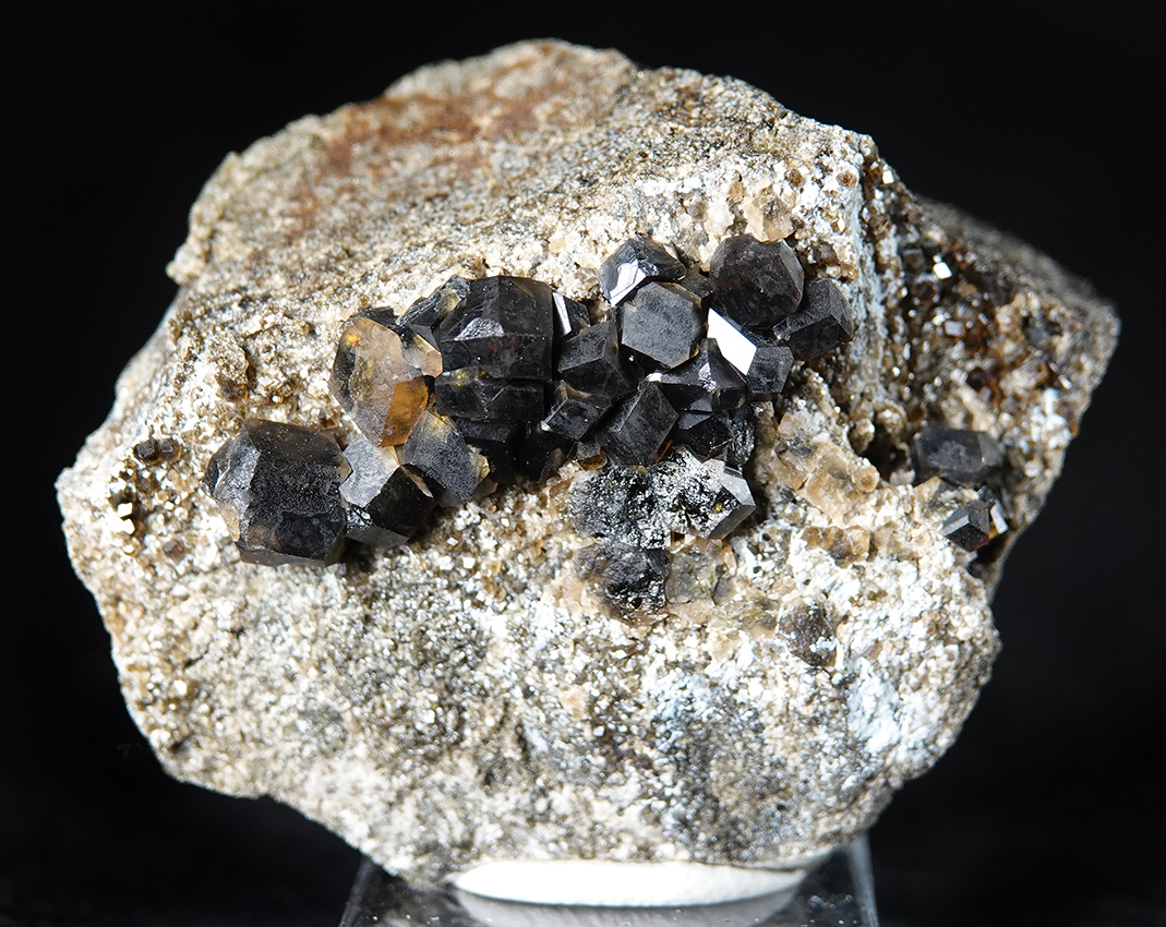 Andradite cristallisée sur gangue. (Minéral blanc non identifié).