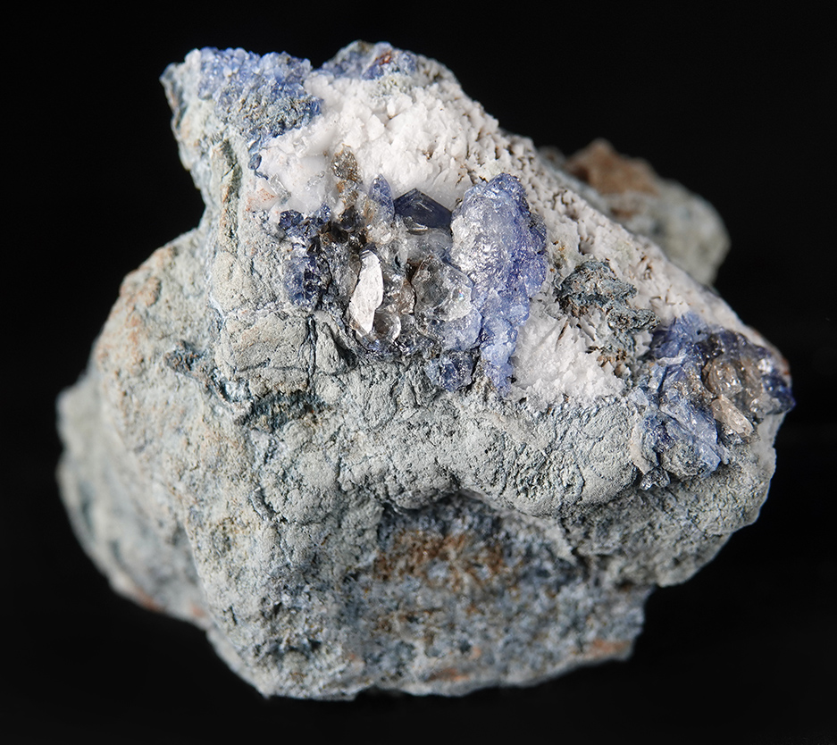 Bénitoïte et natrolite sur gangue. (Spécimen pour vitrine UV).