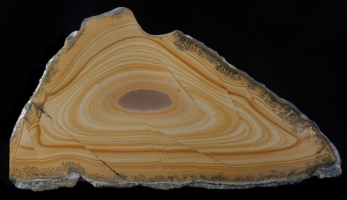 Tranche polie de calcaire à figures concentriques et dendrites.