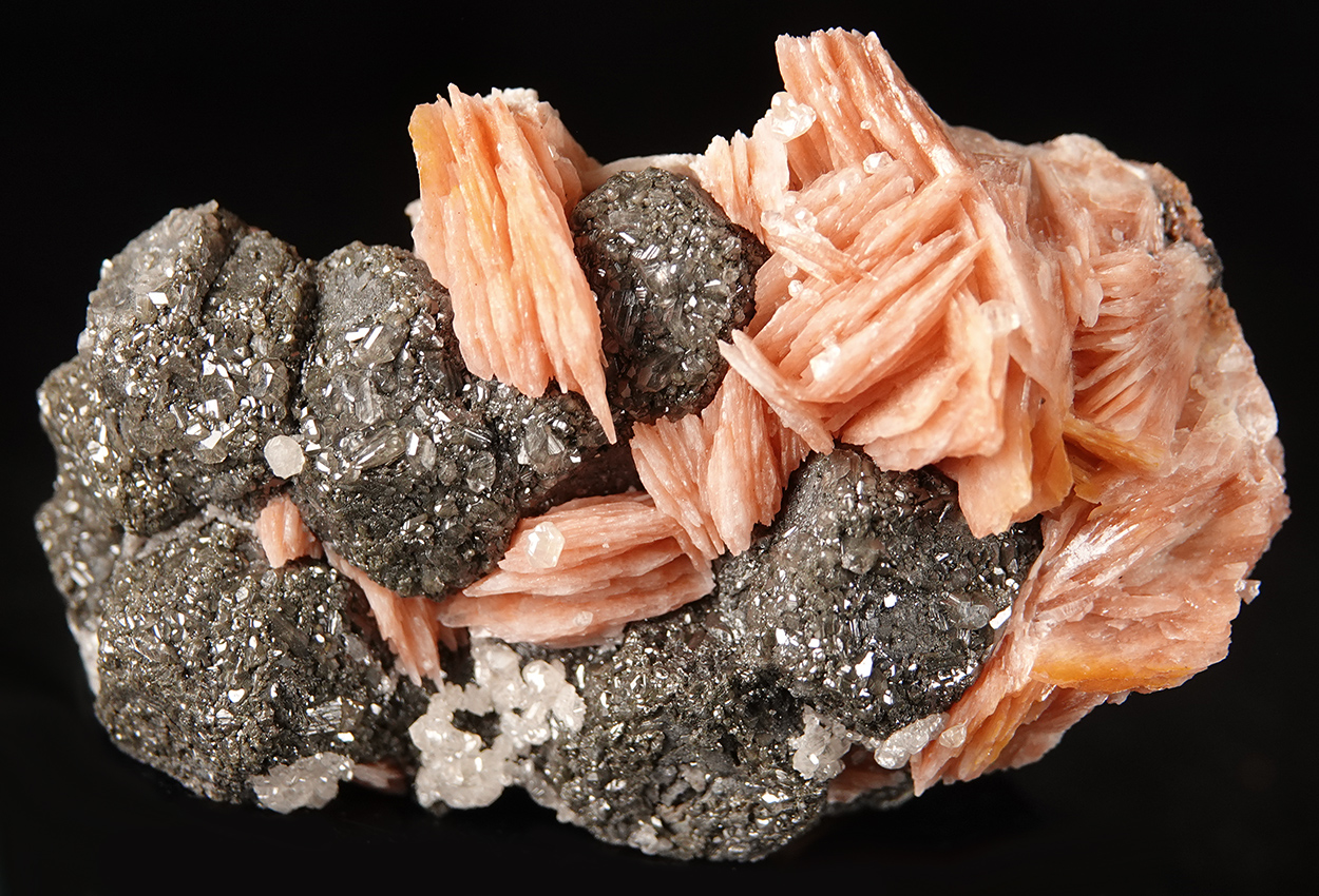 Cristallisations brillantes de cérusite en périmorphose sur galène, avec baryte crêtée.