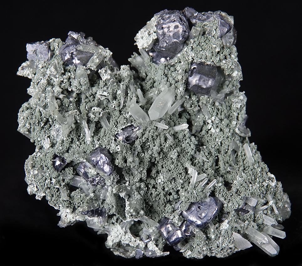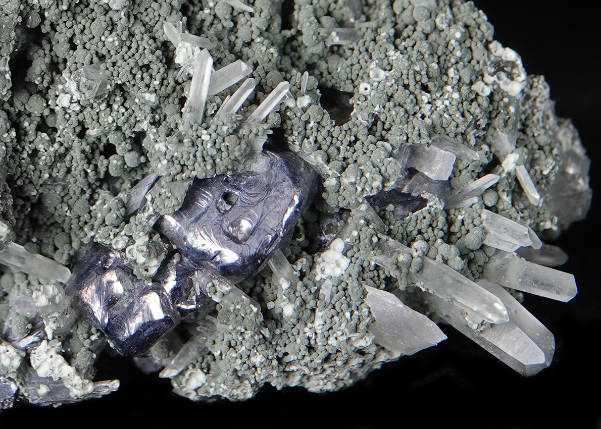 Cristaux de galène à arêtes arrondies avec quartz partiellement recouvert de chlorite (et petits cristaux de sphalérite au dos de la pièce).