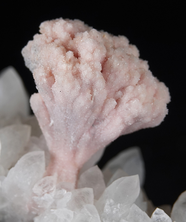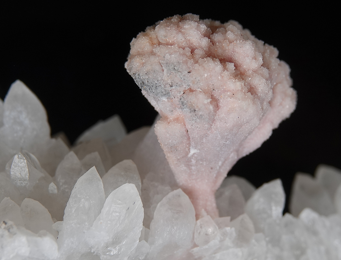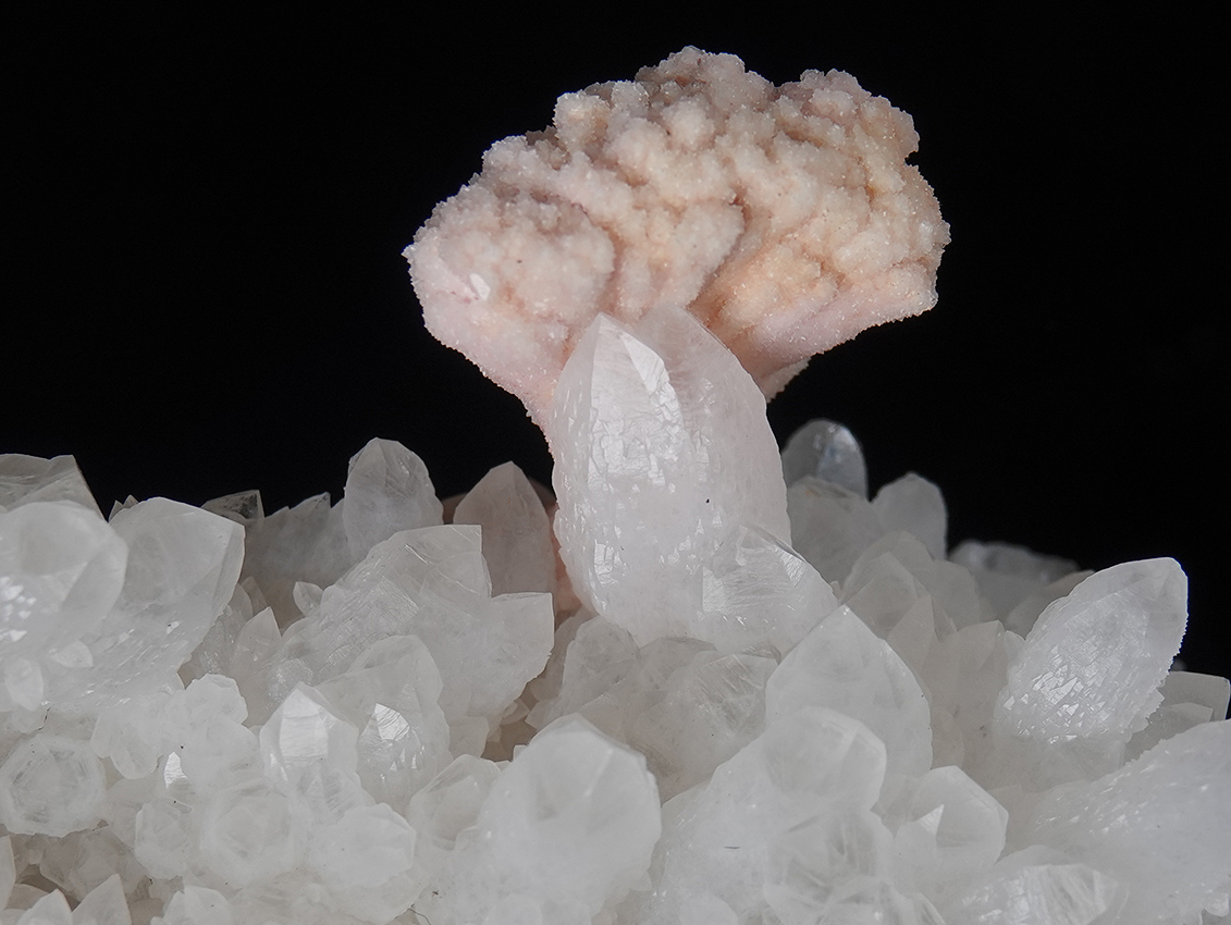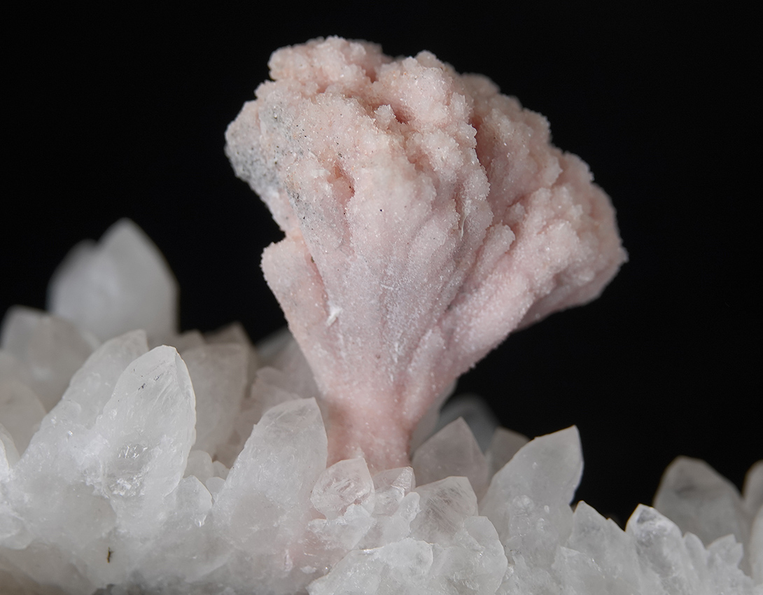 Exceptionnel « chou fleur » de kutnahorite recouverte d’une fine cristallisation de calcite, sur gangue de quartz cristallisé (avec un peu de sphalérite et de pyrite au dos de la pièce).