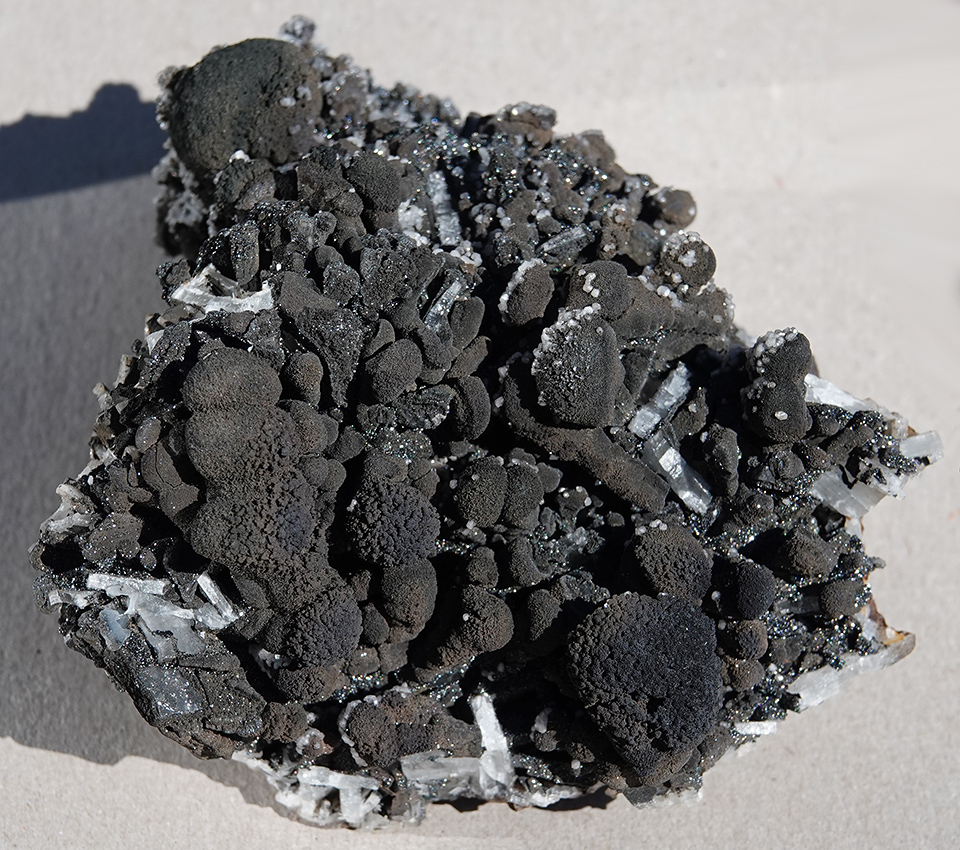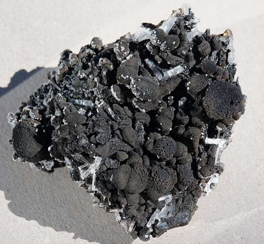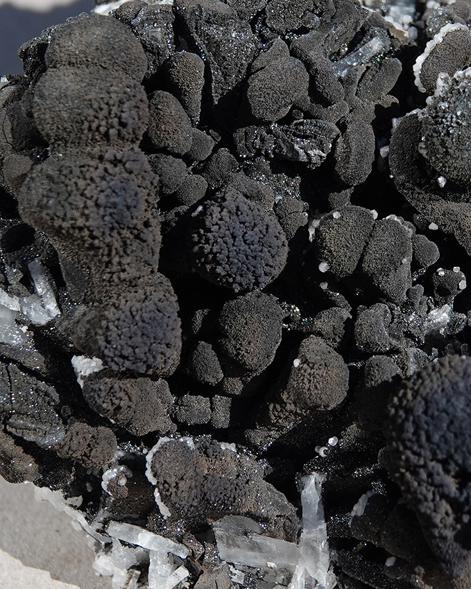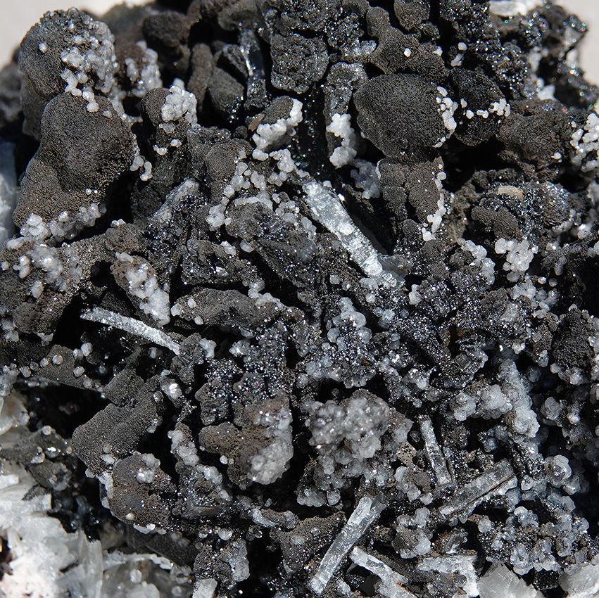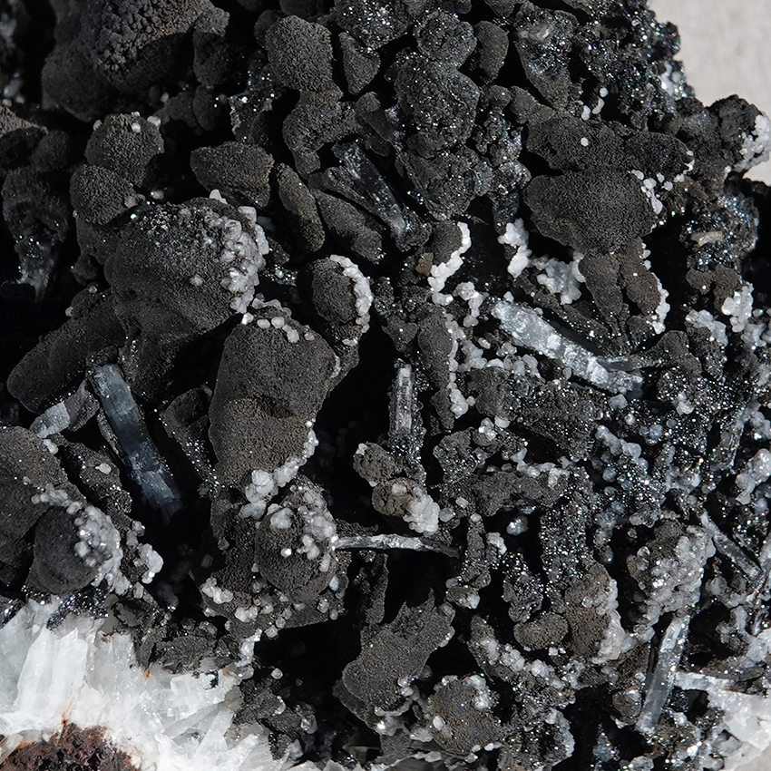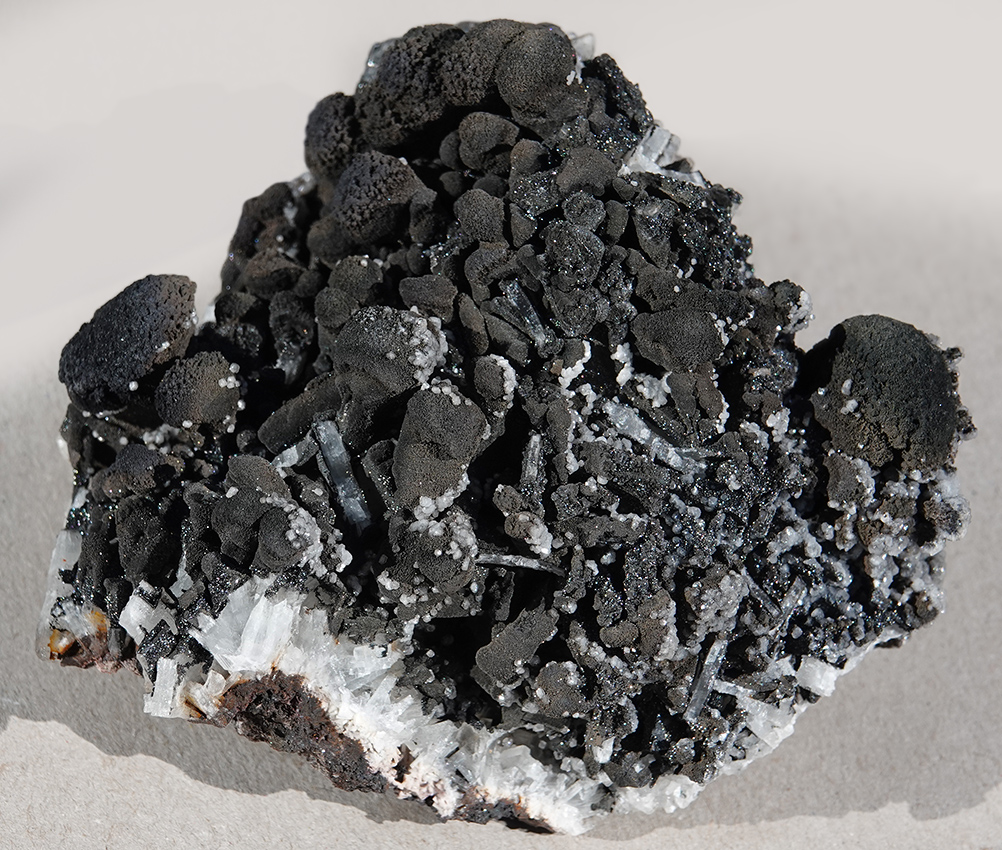Pyrolusite et calcite finement cristallisées sur concrétions de romanèchite, sur baryte tabulaire.