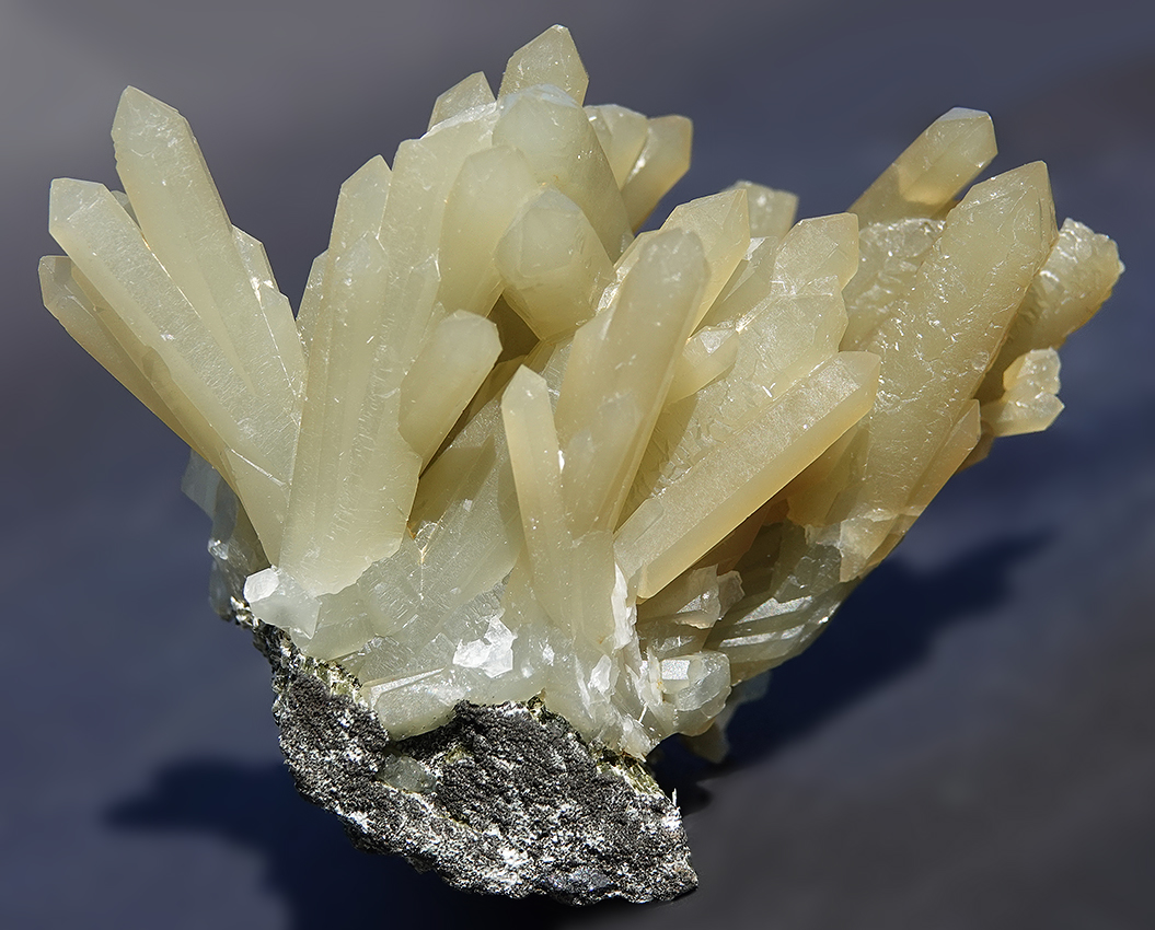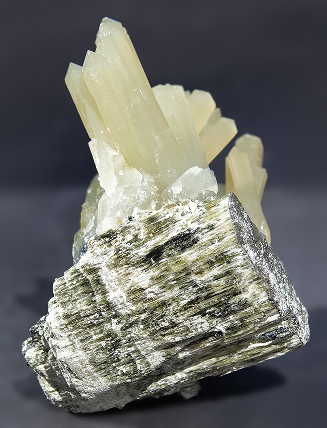 Cristaux de quartz prase vert olive sur hédenbergite et magnétite.