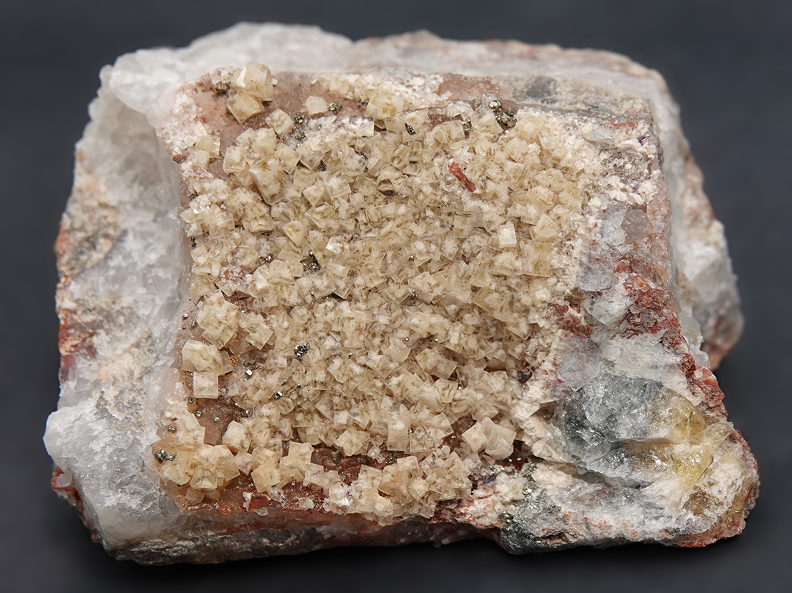 Petits cubes de fluorine et microcristaux de pyrite sur quartz.
