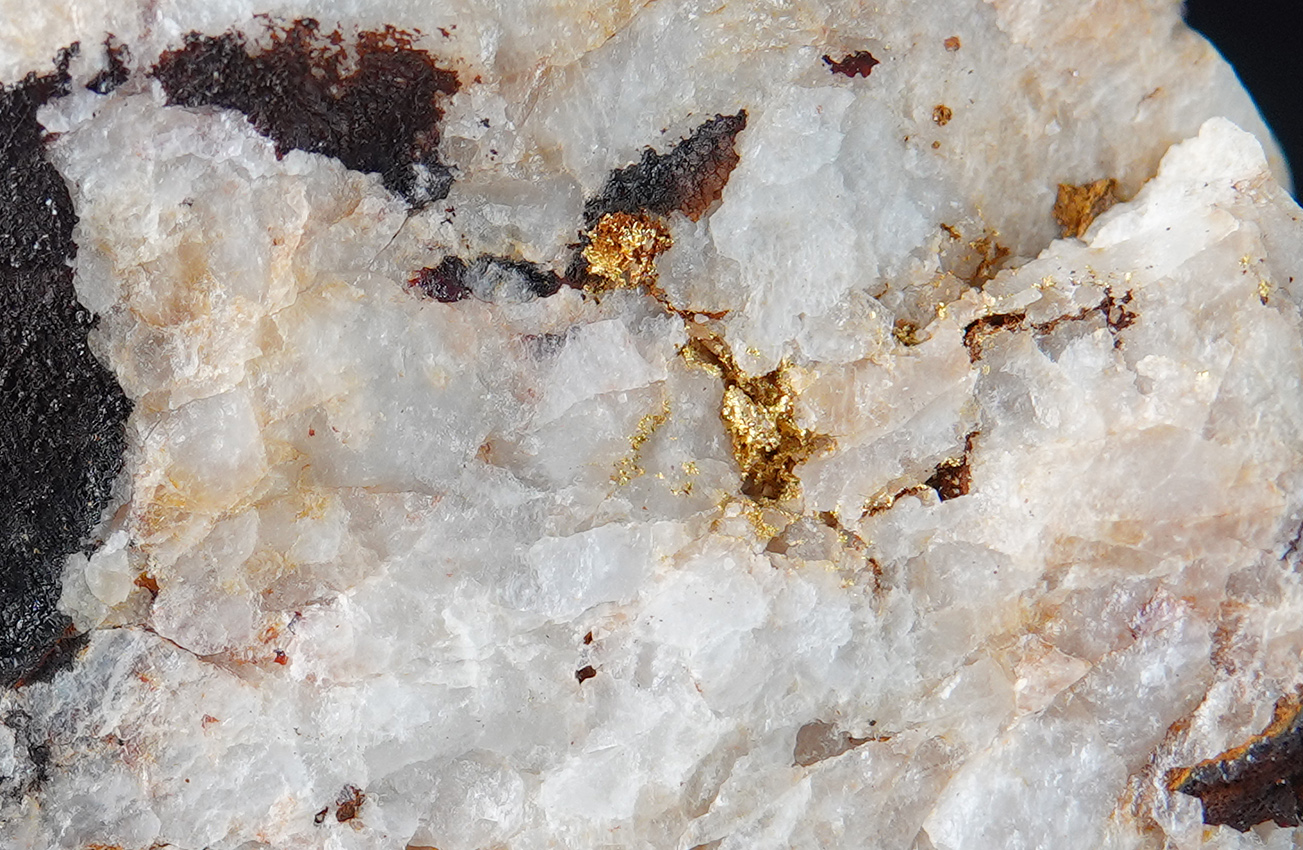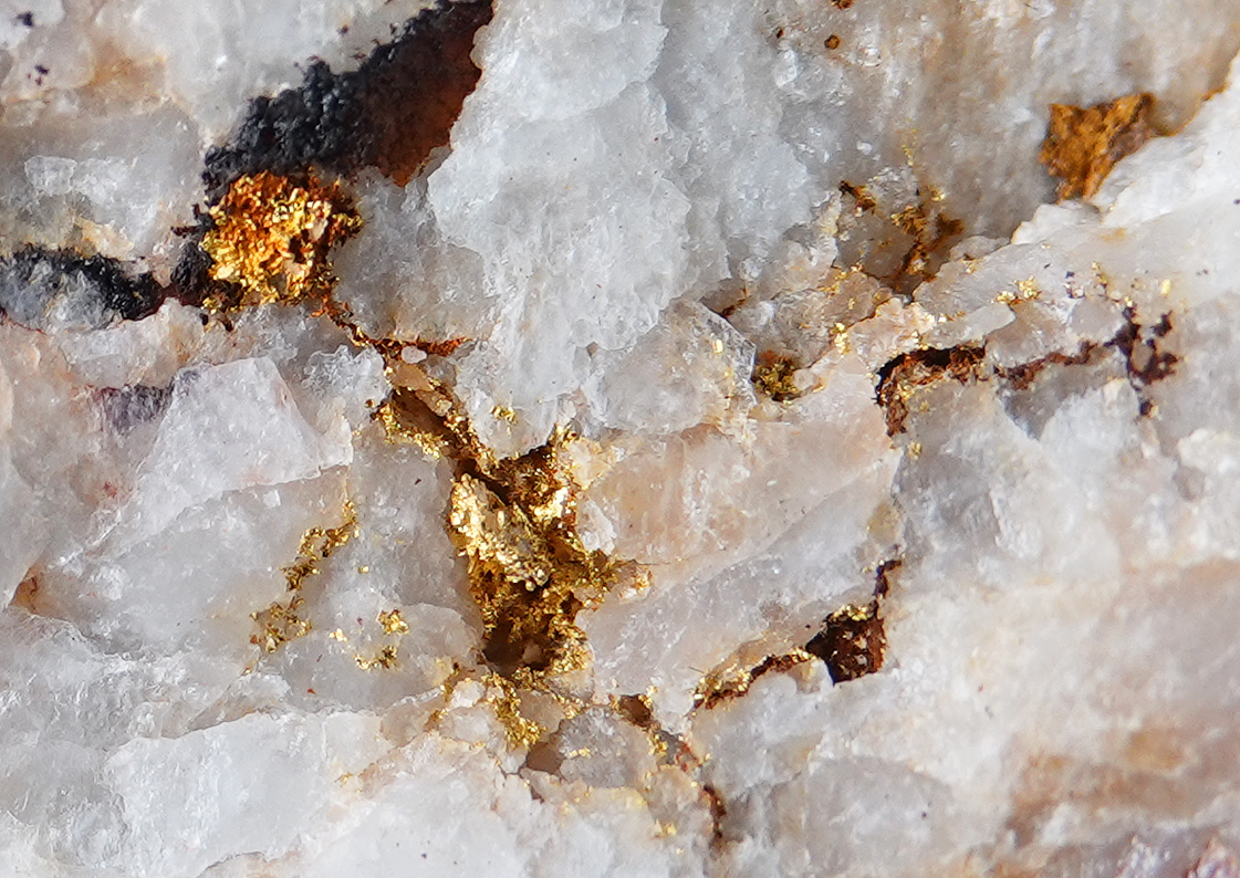 Or natif dans du quartz, avec des oxydes de fer.