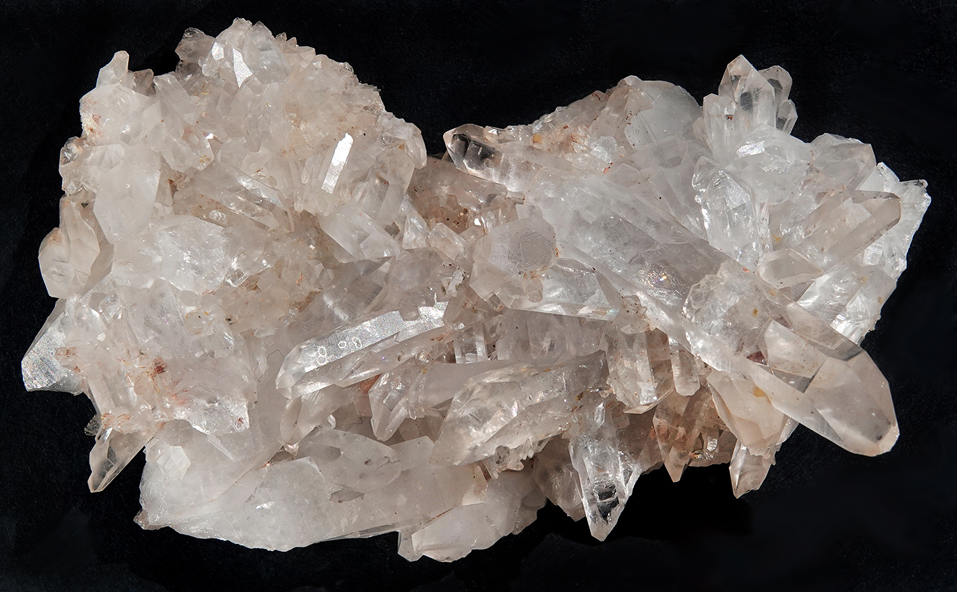 Groupe de cristaux de quartz hyalin (cristal de roche) légèrement taché d’oxydes de fer.